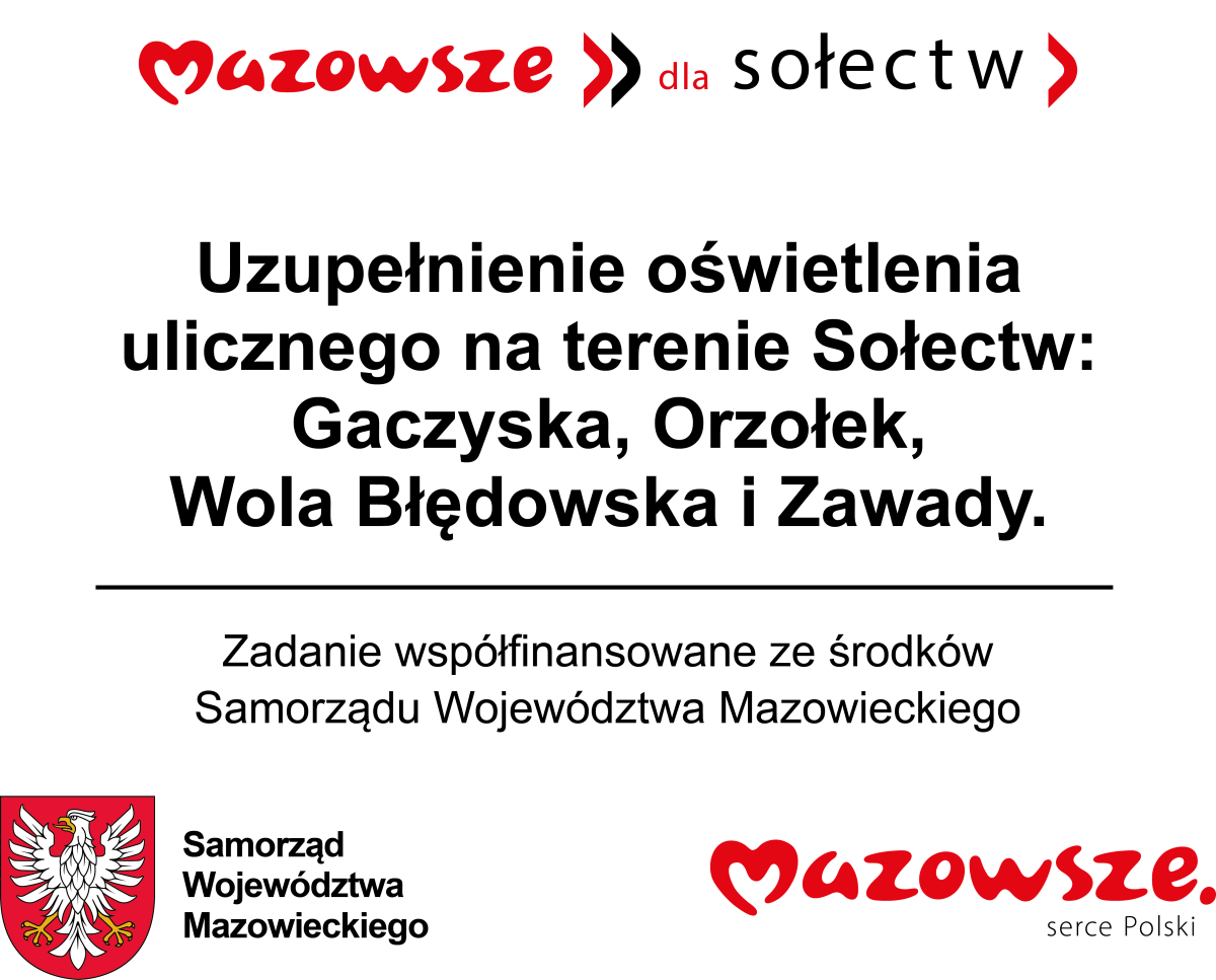 Zadanie pn. „Uzupełnienie oświetlenia ulicznego na terenie Sołectw: Gaczyska, Orzołek, Wola Błędowska i Zawady” dofinansowano ze środków budżetu Województwa Mazowieckiego w ramach „Mazowieckiego Instrumentu Aktywizacji Sołectw MAZOWSZE 2025” - „Mazowsze dla Sołectw 2025”.